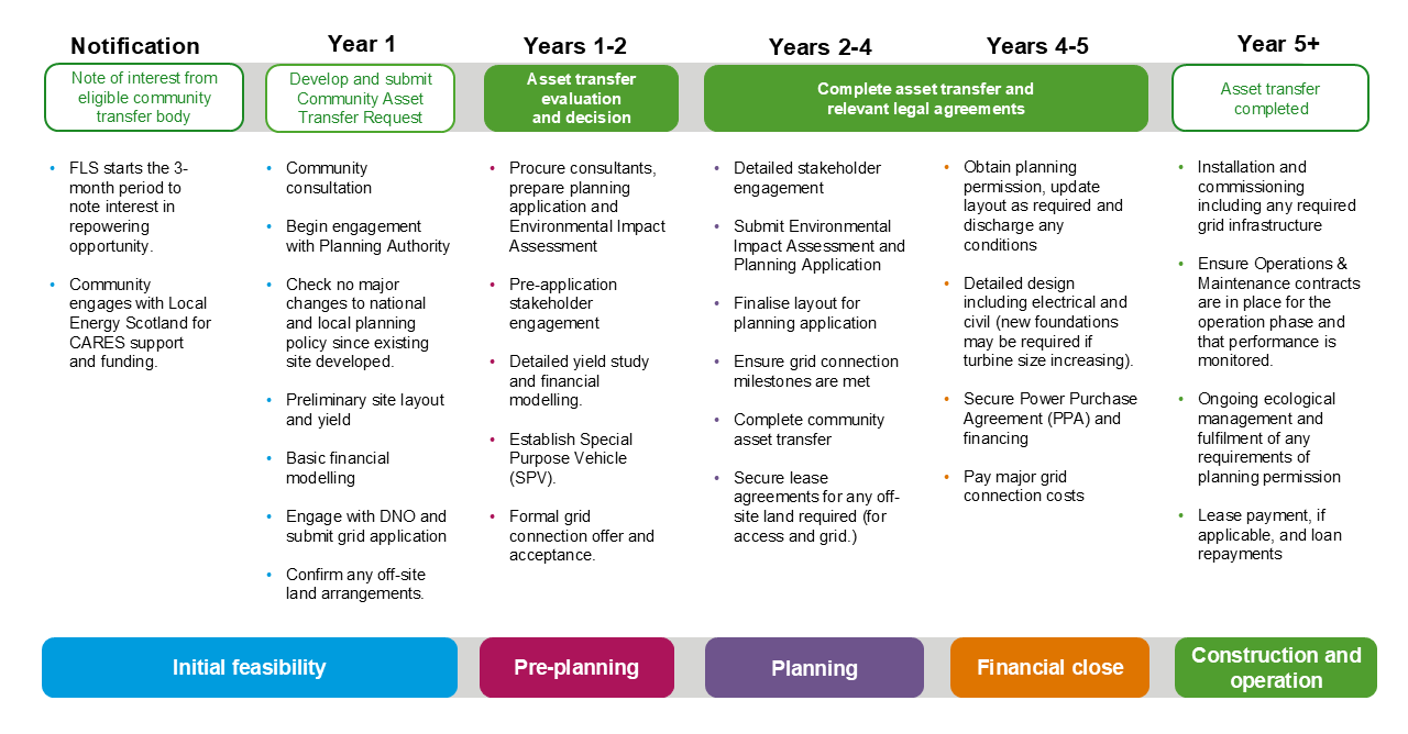 There is support available through the Scottish Government’s Community and Renewable Energy Scheme (CARES) to help communities to get involved and benefit from the energy transition to net zero emissions. The scheme is administered and managed by Local Energy Scotland. CARES can help bring in additional expertise to support you through every stage of your wind farm repowering project, from development to construction and operation.